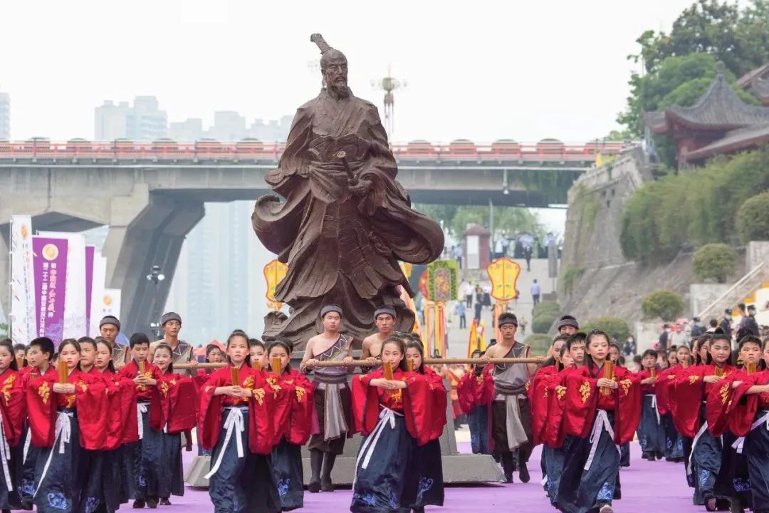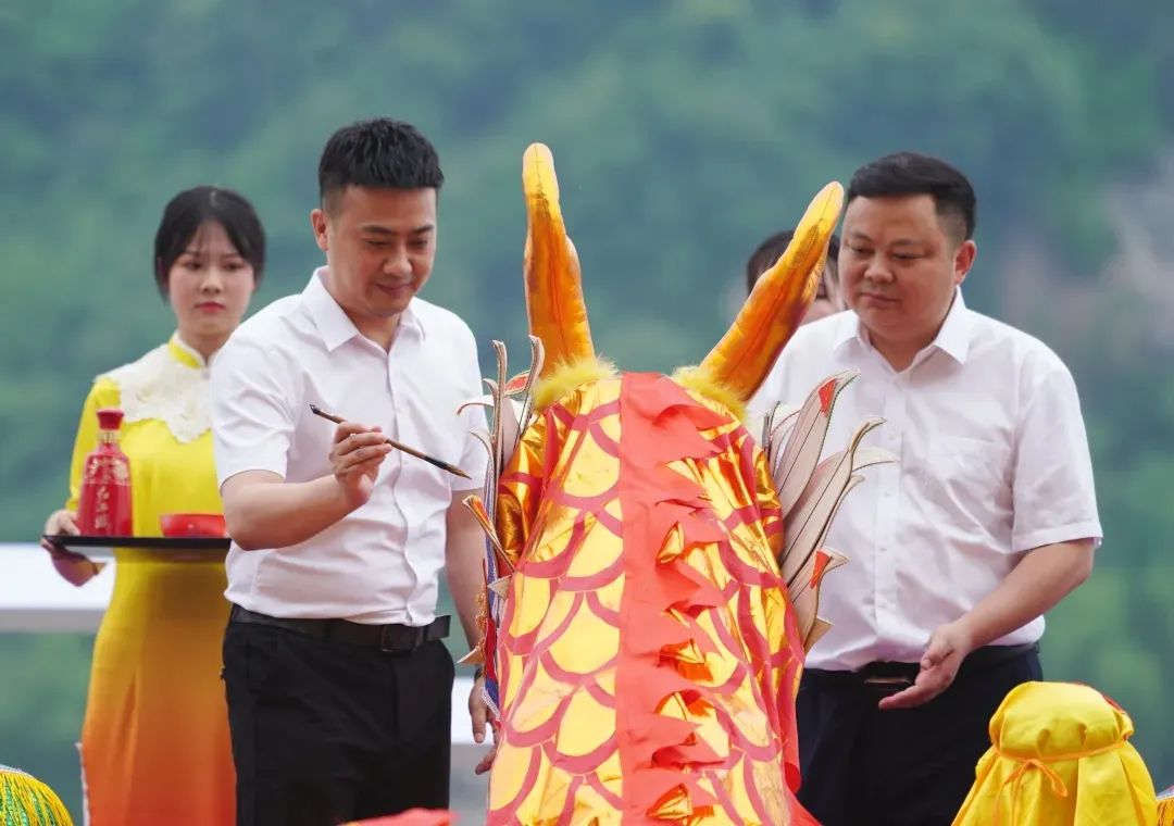 现场锣鼓喧天、鞭炮齐鸣,在九只号角与九面大鼓的齐奏声中,龙舟节主题活动序幕正式拉开。100名身着汉服的小学生缓缓走到舞台中央,齐声咏颂祭文,恭请出爱国诗人屈原的塑像。陕西西凤酒营销管理公司红西凤事业部总经理伍晓东与18位坚守初心践行新时代精神的模范先锋共同为龙头点睛。
