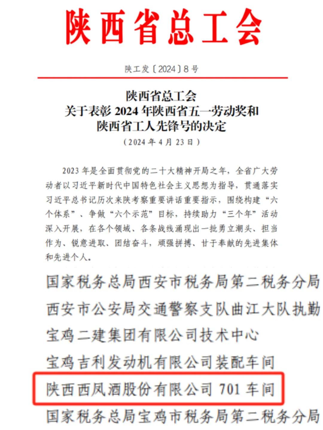 4月23日,陕西省总工会印发了《关于表彰 2024 年陕西省五一劳动奖和陕西省工人先锋号的决定》,陕西西凤酒股份有限公司701车间荣获陕西省“工人先锋号”荣誉称号,受到全省通报表彰。