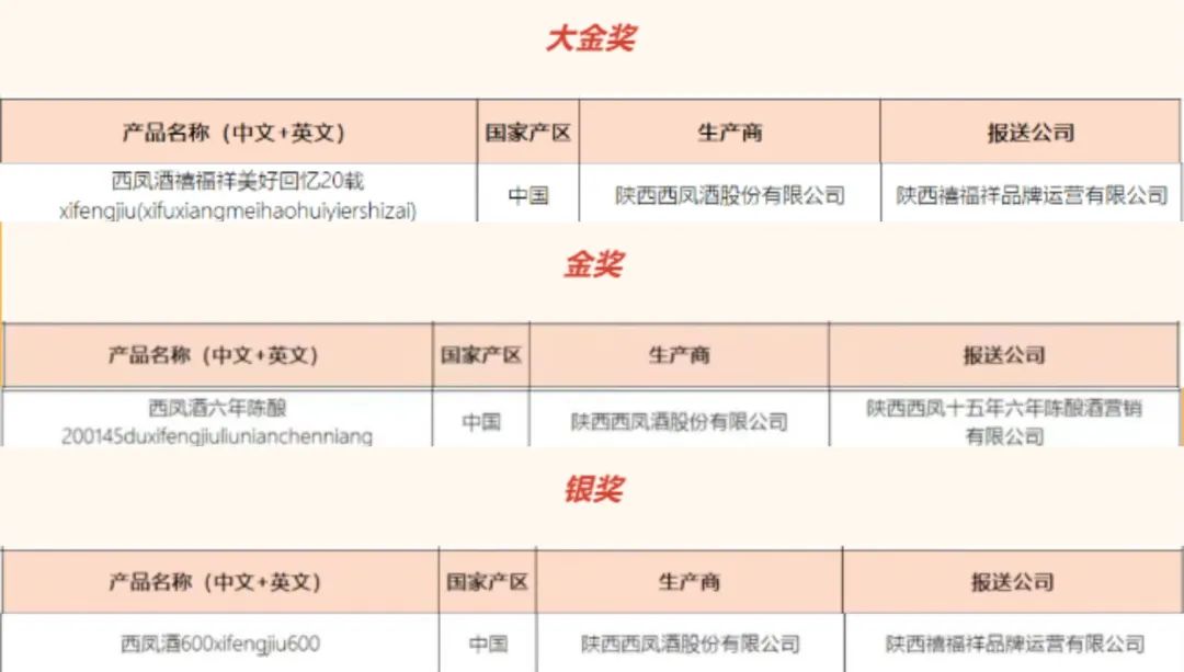 此次比赛是有史以来参赛酒品类别最为齐全的一次,不仅有传统的葡萄酒、白兰地、威士忌、啤酒等,更有代表中国的白酒、黄酒、米酒、清酒、露酒以及果酒等。会上,西凤酒(禧福祥美好回忆20载)荣获白酒类“大金奖”,西凤酒六年陈酿荣获白酒类“金奖”,西凤酒600荣获白酒类“银奖”。一次性摘得3枚沉甸甸的品牌奖章,标志着西凤酒的品质得到了国际专家的高度认可,极大提升了西凤酒的国际影响力。