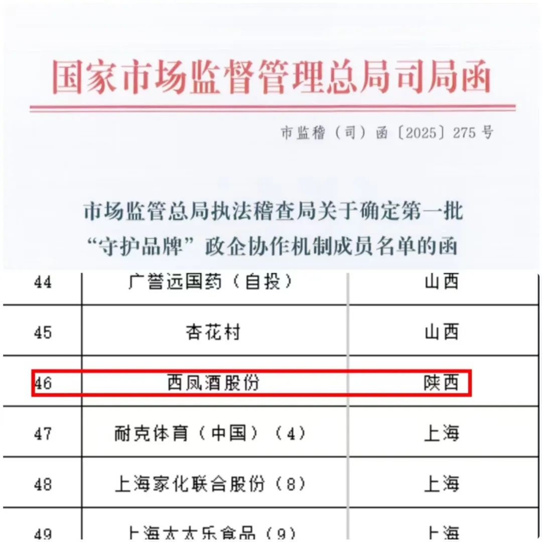 此次入选“守护品牌”政企协作机制首批成员单位,是市场监管部门对西凤酒在品牌建设成效、产品质量管控、消费者权益维护和品牌影响力等方面的肯定。公司将进一步加强知识产权保护工作,提升品牌价值和市场竞争力,加强与各级市场监管部门的协作,积极履行成员企业职责,打击侵权假冒、净化市场环境、维护企业和消费者权益,为地方经济发展和知识产权强国建设贡献西凤力量。同时也呼吁广大消费者通过正规渠道购买西凤产品,共同维护良好的市场环境。